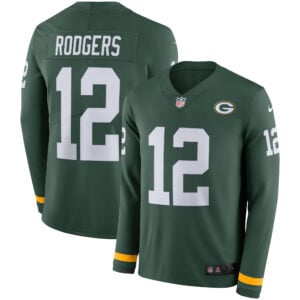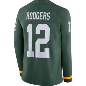 Celebrate Wisconsin pride with the Aaron Rodgers Green Bay Packers Green Therma Long Sleeve Jersey. Representing the legendary Green Bay Packers, also known simply as the Packers, this jersey honors Rodgers’ unforgettable impact on the team and fanbase. The classic green design reflects the heart of Wisconsin football.