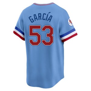 This Adolis Garcia Texas Rangers Light Blue 1981-82 Cooperstown Limited Jersey – All Stitched is an essential piece of gear for any Texas Rangers fan looking to highlight their favorite jersey and player. The Adolis Garcia Texas Rangers Light Blue 1981-82 Cooperstown Limited Jersey and team details provide a kickoff-ready look that elevates your excitement for game day. Made with comfort in mind, this Texas Rangers jersey delivers a standard, lightweight fit and features breathable mesh side panels for added ventilation.