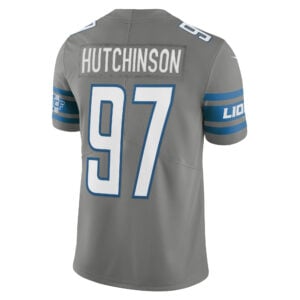 This Aidan Hutchinson Detroit Lions Grey Alternate Vapor F.U.S.E Limited Jersey – All Stitched is an essential piece of gear for any Detroit Lions fan looking to highlight their favorite jersey and player. The Aidan Hutchinson Detroit Lions Grey Alternate Vapor F.U.S.E Limited Jersey and team details provide a kickoff-ready look that elevates your excitement for game day. Made with comfort in mind, this Aidan Hutchinson Detroit Lions jersey delivers a standard, lightweight fit and features breathable mesh side panels for added ventilation.