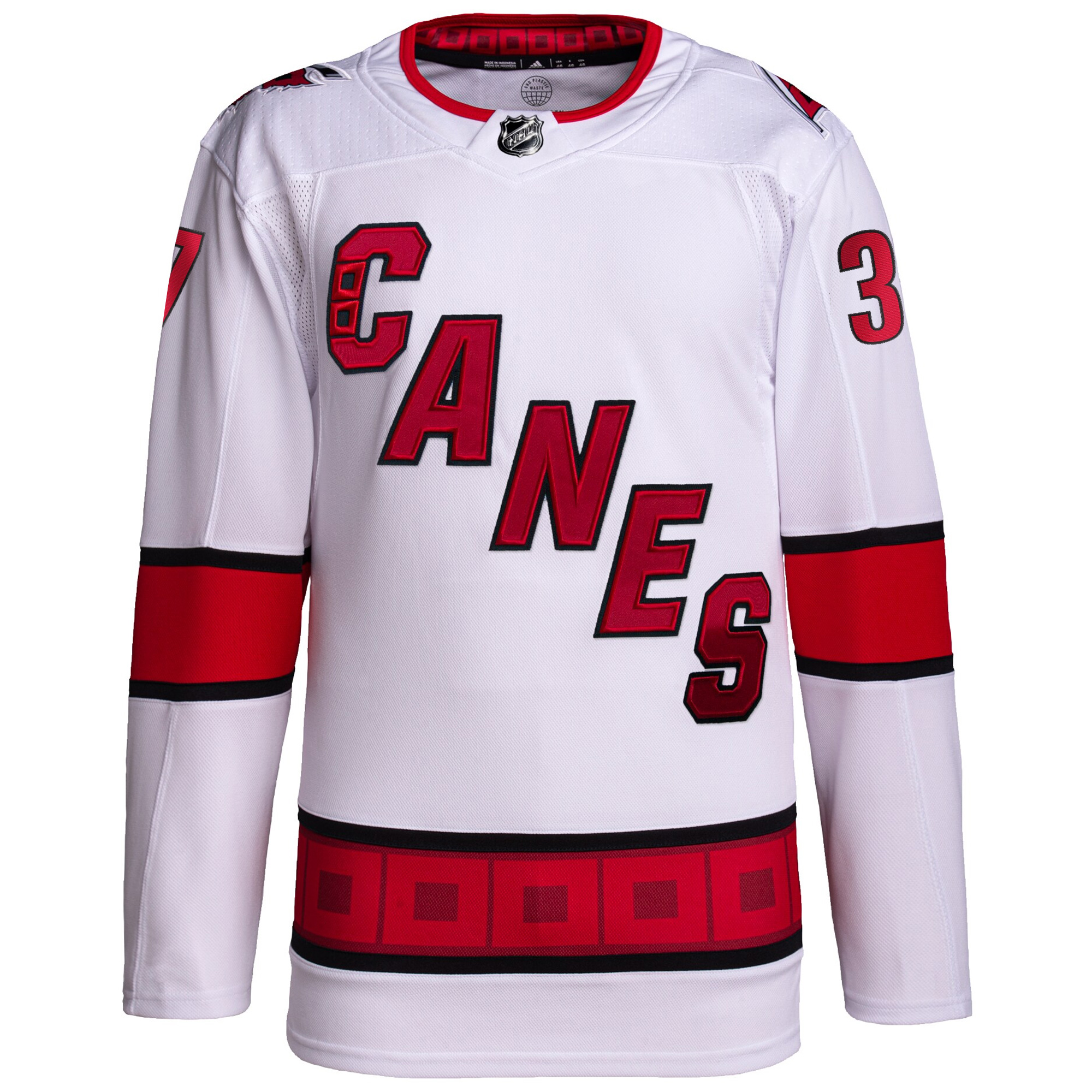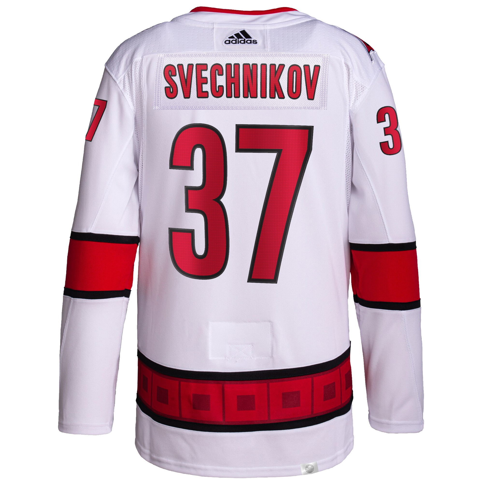 The Andrei Svechnikov Carolina Hurricanes White Away Primegreen Jersey – All Stitched delivers road tradition with a sustainable twist. Stitched name and number, embroidered Hurricanes logos, and eco-friendly Primegreen materials highlight a modern take on Carolina hockey pride.