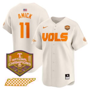 This Billy Amick Tennessee Volunteers College Baseball World Series Champions Jersey – Cream is an essential piece of gear for any Billy Amick fan looking to highlight their favorite player. The Billy Amick Tennessee Volunteers jersey and team details provide a kickoff-ready look that elevates your excitement for game day. Made with comfort in mind, this Billy Amick jersey delivers a standard, lightweight fit and features breathable mesh side panels for added ventilation.