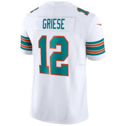 The Bob Griese Miami Dolphins White Alternate Vapor F.U.S.E Limited Jersey – All Stitched offers fans a refined take on Dolphins pride. Designed featuring a “standard fit,” Dri-FIT technology, heat-transferred twill name and numbers, and a chainmaille mesh grill at the collar, it mixes innovation with tradition. Stitched details across the name, number, patches, and logos highlight the quality that Miami and Florida fans demand.