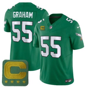 Showcase your love for classic Philadelphia Eagles football with this Brandon Graham Kelly Green Throwback Vapor F.U.S.E Limited Jersey. The PHI identity shines through with fully stitched name, number, Captain patch, and embroidered team elements. The Kelly Green shade pays homage to historic Pennsylvania football roots, making it a standout piece for collectors and loyal fans alike. With a modern Vapor F.U.S.E cut and oversized options in 5XL, 6XL, and 7XL, this jersey offers both style and versatility.