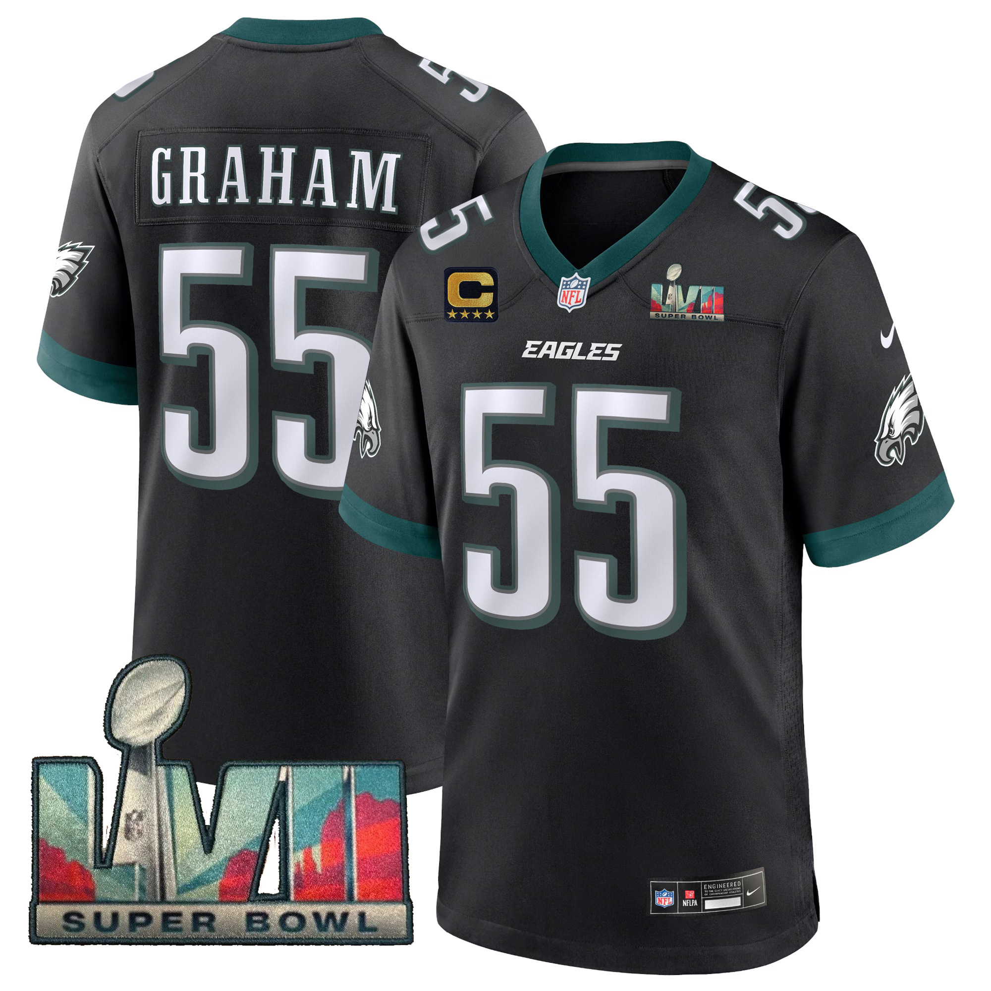 Rep “PHI” pride with bold energy in this Brandon Graham Philadelphia Eagles Super Bowl LVII Black Game Jersey. Designed to honor the team’s journey and Pennsylvania roots, this jersey features all stitched details—name, number, logo, and the Super Bowl LVII patch—delivering a rugged and premium feel. The black colorway adds a striking modern edge while keeping every embroidered element crisp and eye-catching. Perfect for fans who want a powerful look that represents the Eagles’ spirit. Oversized sizing options are available as well, including men’s 5XL, 6XL, and 7XL.