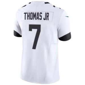 This white road Vapor F.U.S.E Limited jersey of Brian Thomas Jr delivers both style and innovation, featuring a “standard fit,” Dri-FIT technology, heat-transferred twill detailing, and chainmaille mesh collar design. Every element from the Jaguars logo to the stitched number celebrates Florida pride and the JAX spirit.