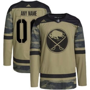 Show your gratitude and state pride with the Custom Buffalo Sabres Camo Military Appreciation Jersey. Combining Sabres heritage with military-inspired detail, this design represents unity, strength, and respect. The stitched name, number, patch, and embroidered logo highlight premium quality and lasting craftsmanship. Featuring a modern camouflage pattern, this jersey pays tribute to service members while celebrating New York hockey spirit. Whether displayed, worn to the game, or personalized for a unique touch, it’s the perfect way to honor both team and country. Stand tall, stand proud, and show your Sabres loyalty with this limited stitched jersey!