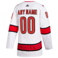 The Custom Carolina Hurricanes White Away Jersey – All Stitched ensures Canes fans stay connected to their team across the road. Designed with stitched player details, embroidered logos, and patchwork representing Hurricanes identity, this jersey proudly shows North Carolina hockey passion.