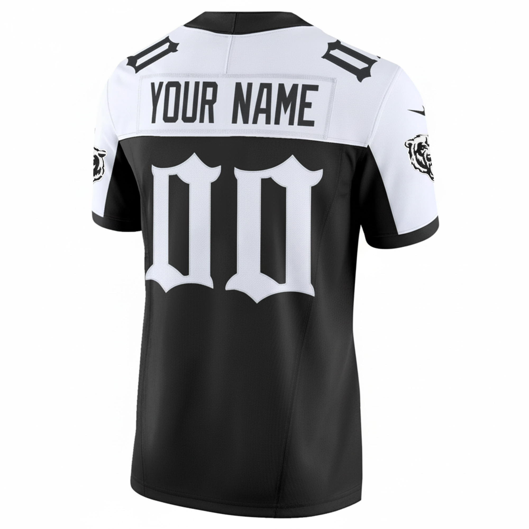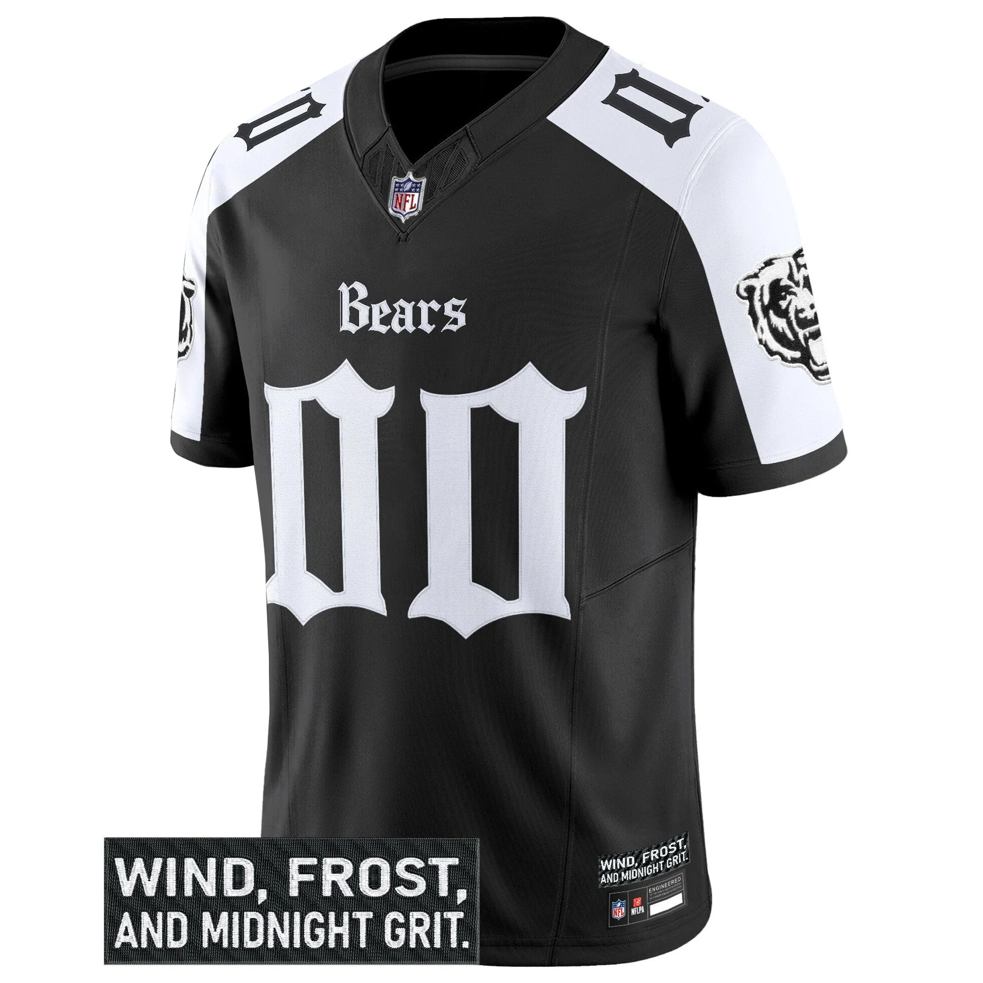 Turn up Chicago intensity with this Custom Chicago Bears Gothic Theme Alternate Black Vapor F.U.S.E Limited Jersey. The alternate black design brings a sharp, dramatic twist to CHI pride, while your stitched name and embroidered numbers complete the personalized look. Embroidered Bears logos and detailed patches add rich team identity, creating a jersey that stands out with every detail. Perfect for fans wanting something different yet deeply rooted in Chicago tradition, this Gothic-inspired piece elevates your Bears style with edge and character.