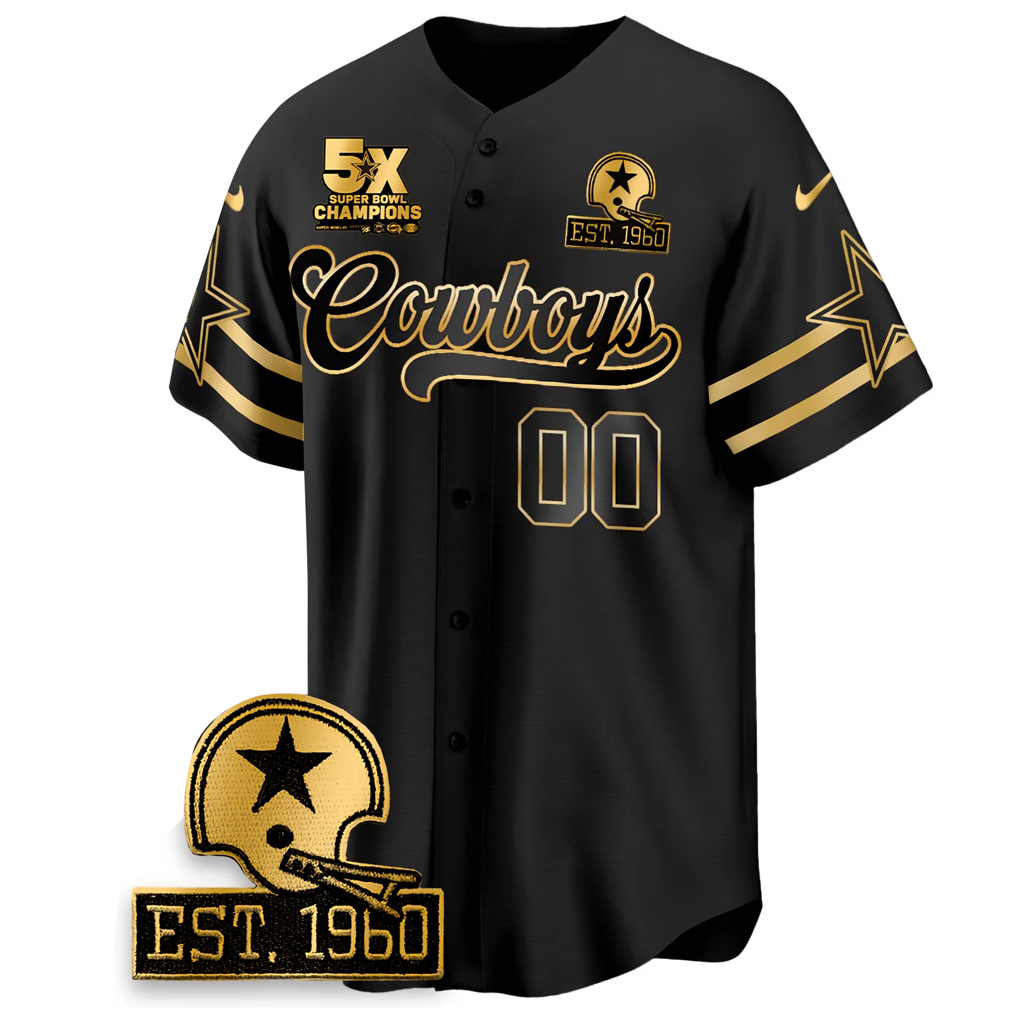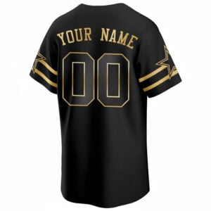 Celebrate the Dallas Cowboys’ championship legacy with the Custom 5 Time Champions Black Gold Baseball Jersey. This premium jersey showcases the Cowboys’ iconic name, number, and logo stitched or embroidered with precision. The striking black and gold design is a tribute to the Cowboys’ five championship wins, while the state pride patch completes the look. Perfect for game day or casual wear, the jersey comes in oversized sizes for a comfortable, relaxed fit.