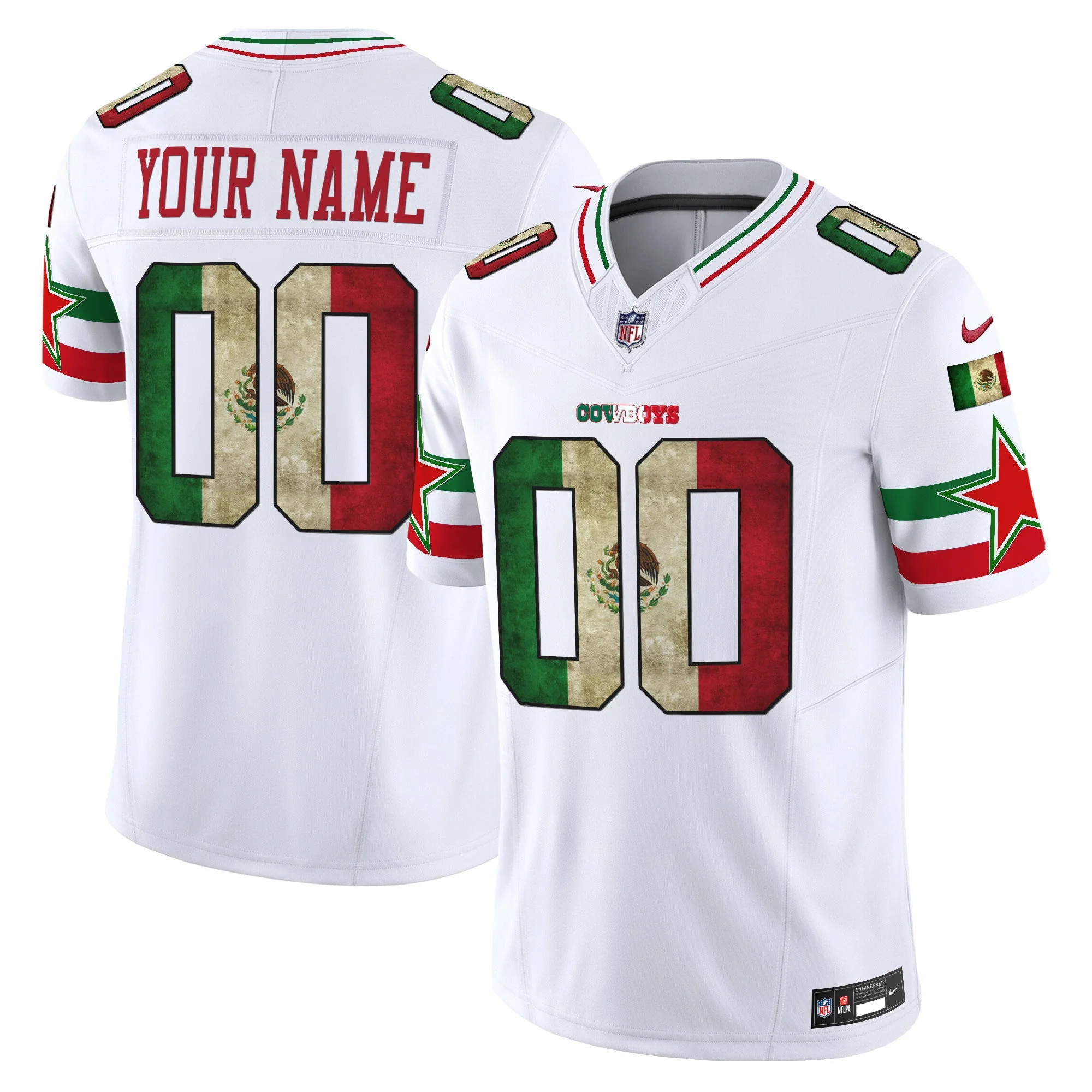 Celebrate your Cowboys pride with this Custom Dallas Cowboys Mexico White Vapor F.U.S.E Limited Jersey. The clean white design, featuring the Mexico edition patch, adds a bold look to your Cowboys collection. Fully stitched or embroidered name, number, patch, and logo ensure a high-quality finish that stands the test of time. With oversized sizes (5XL, 6XL, 7XL) available, this jersey is perfect for any Cowboys fan who wants to represent the team in style and comfort.