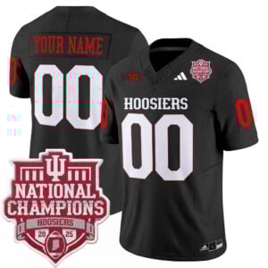 Celebrate Indiana University’s championship moment with this black CFP National Championship jersey. The Hoosiers name represents Indiana pride, and this darker colorway delivers a bold, confident look. Stitched player name and number ensure durability, while embroidered IU logos and championship patches elevate the overall design. Perfect for fans who want a powerful visual tied to a historic win, this jersey stands out on any occasion. Oversized sizing is available, offering comfort without sacrificing style.