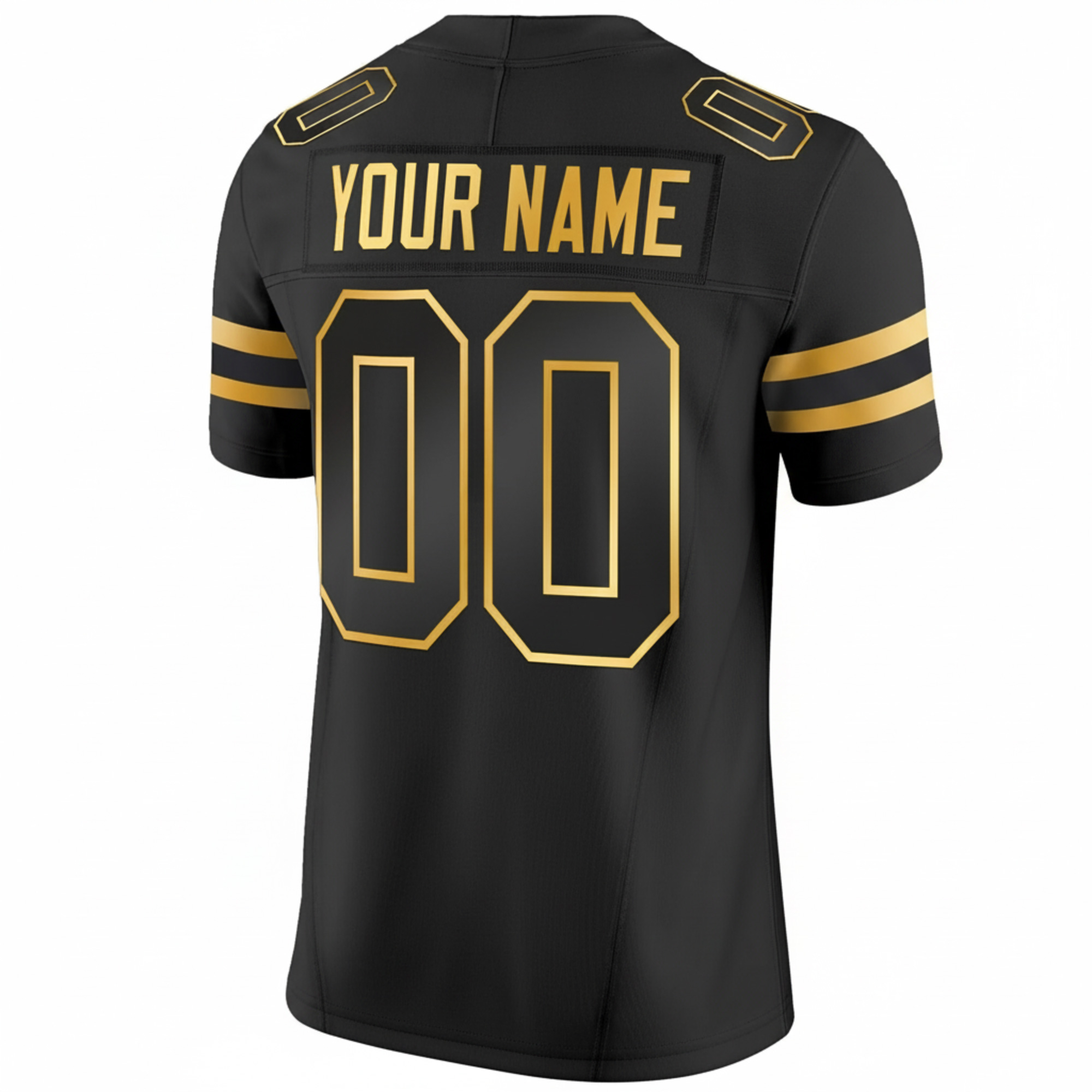This Black Gold Jersey elevates Miami Hurricanes style with a refined color combination. Featuring the Hurricanes team name and Canes short name, the black base with gold accents highlights Florida pride in a bold way. Custom stitched name and number stand out clearly, supported by embroidered logos and Cotton Bowl patches. The gold detailing adds contrast and visual impact, making this jersey perfect for standout wear. Comfortable and stylish, oversized sizing is available.