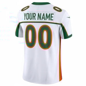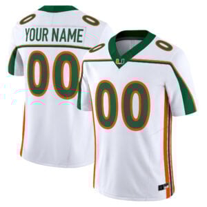 This White Throwback Vapor F.U.S.E Limited Jersey celebrates the University of Miami Hurricanes with classic collegiate energy. Featuring the full Miami Hurricanes team name and the Canes short name, the design reflects deep Florida state pride rooted in tradition. Custom name and number are fully stitched for clean definition, while Hurricanes logos and throwback-style patches are carefully embroidered to enhance texture and detail. The white base delivers a timeless look that works on game day or casual outings. Designed for comfort and standout style, oversized sizes are also available.