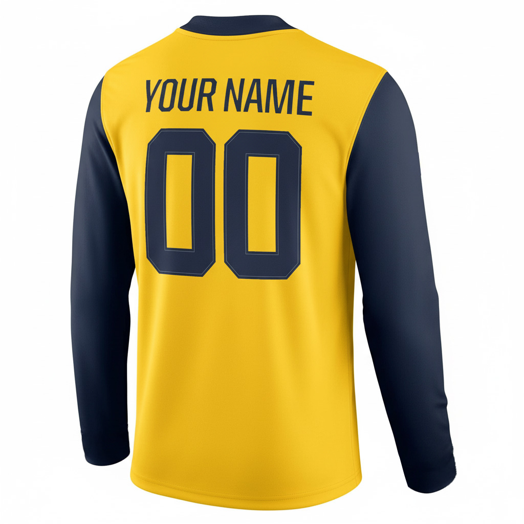 Stand out in bold Michigan fashion with this Custom Wolverines Football Maize Inverted Therma Long Sleeve Jersey. With your stitched custom name and number and the embroidered UM logo, this inverted design brings a fresh twist to classic Wolverine energy. The vibrant maize color celebrates Michigan pride and the unmistakable culture surrounding the team. Crafted with Therma material, it’s warm, comfortable, and ready for every fan moment.