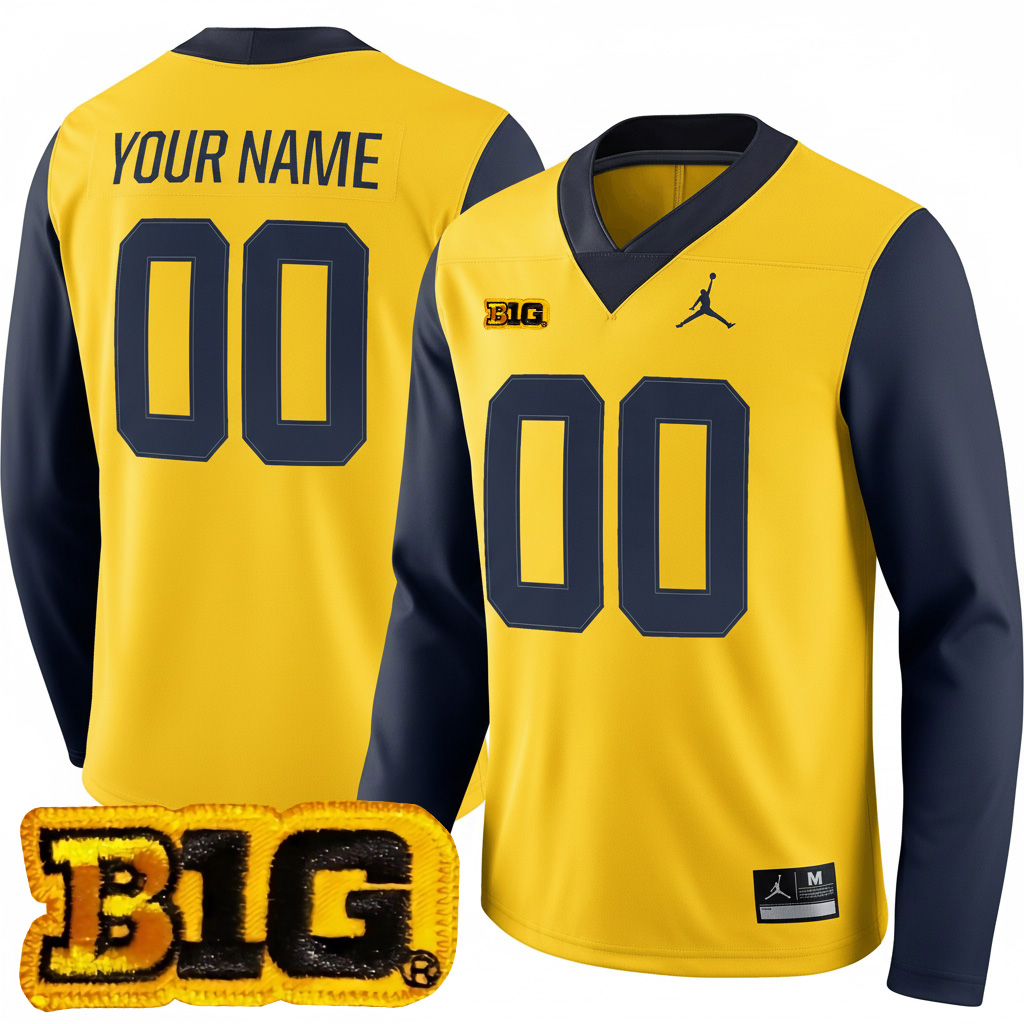 Show off Michigan spirit in this Custom Wolverines Maize Inverted Therma Long Sleeve Jersey featuring an embroidered B1G patch. The stitched custom name and number and embroidered Michigan logo stand out against the unique inverted maize design, celebrating UM pride and the legacy of Michigan football.