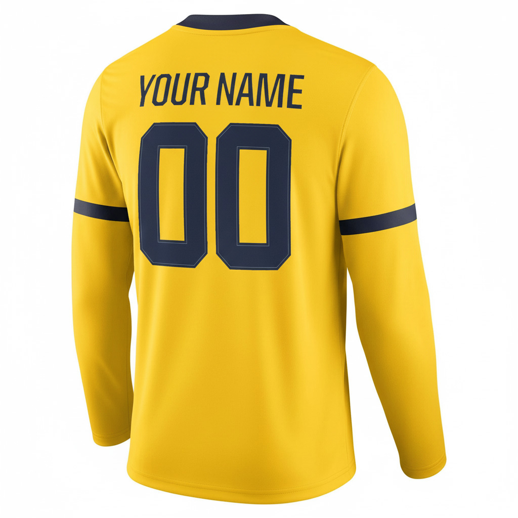 Represent UM and Big Ten heritage with this Custom Michigan Wolverines Maize Therma Long Sleeve Jersey. Featuring a crisp embroidered B1G patch, stitched custom name and number, and embroidered Michigan logo, it carries strong state pride. The maize color highlights classic Wolverine tradition in a bold way.