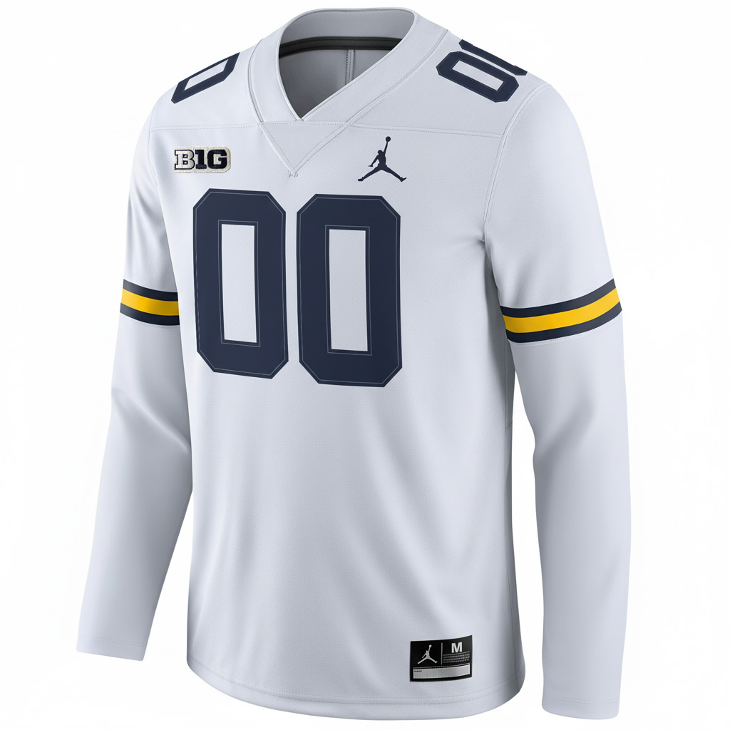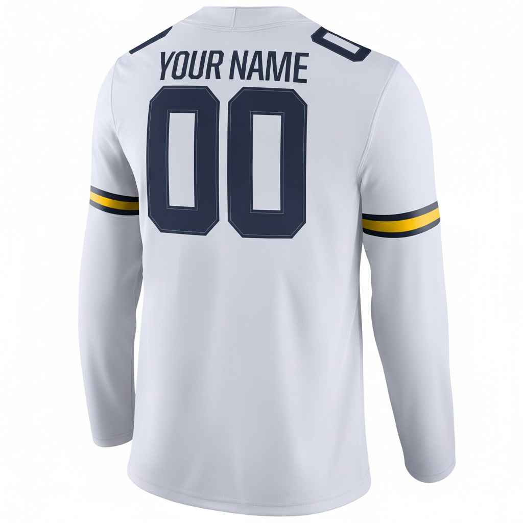 This Custom Michigan Wolverines Football White Therma Long Sleeve Jersey brings together UM tradition and Big Ten energy. With a sharp embroidered B1G patch, stitched custom name and number, and embroidered logo, this jersey celebrates Michigan excellence. The clean white base stands out and reflects Wolverine pride across the state.