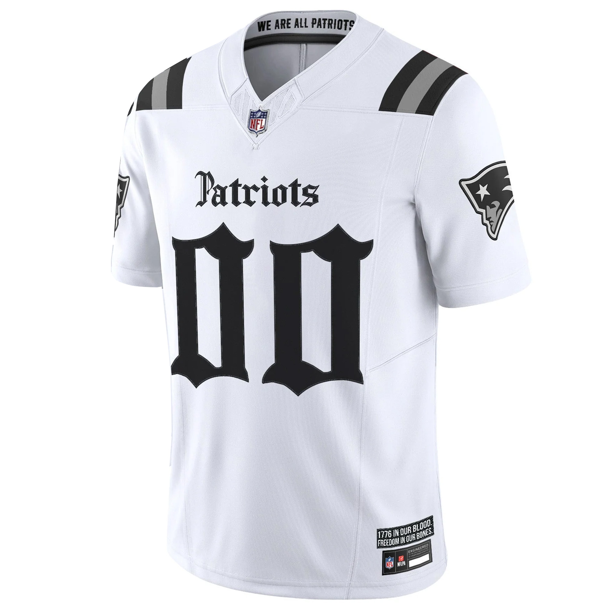 Clean meets bold in the Gothic Revolution Edition White Vapor F.U.S.E Limited Jersey. Featuring a striking contrast of gothic design and classic New England Patriots identity, this jersey highlights stitched or embroidered team name, Pats branding, number, logo, and Revolution patch. The white base adds balance while still honoring New England state pride. Perfect for fans who want something unique yet wearable, this jersey is available in oversized sizes for all-day comfort.