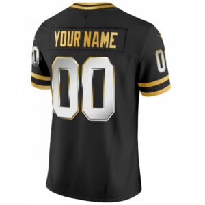 Showcase a premium version of New York pride with this Black Gold Limited 100th Season Anniversary custom jersey celebrating the New York Giants. The dark base and metallic gold detailing create a bold, upscale aesthetic tied to NYG heritage. Personalize your name and number, fully stitched or embroidered alongside the logos and commemorative patches for a polished finish. Perfect for collectors or fans wanting a standout limited look. Oversized sizes 5XL–7XL available.