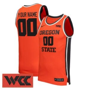 This orange away-inspired basketball style features a WCC patch celebrating Oregon State University’s move into the West Coast Conference. The Beavers short name reflects determination and Oregon state pride.