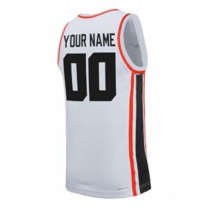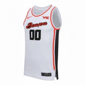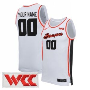 This white home basketball design with a WCC patch marks a new chapter for Oregon State University as the Beavers compete within the West Coast Conference. The Beavers short name represents resilience and Oregon pride during this transition.