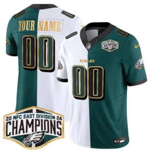 Finish strong with the Black Green Split Gold Trim 2024 NFC East Division Champions jersey. This bold split-color design highlights Philadelphia Eagles pride, Eagles short name branding, and Pennsylvania football culture. The stitched or embroidered name, number, logo, and champions patch deliver premium detail. Oversized sizes are available, perfect for fans who want standout style with everyday comfort.
