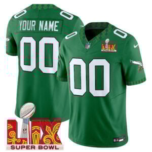 Celebrate Philadelphia Eagles pride with a festive twist in this St. Patrick’s Day Super Bowl LIX Kelly Green jersey. Designed around the Eagles team name, Eagles short name identity, and Pennsylvania state pride, this jersey blends championship energy with bold holiday color. The name, number, logo, and Super Bowl LIX patch are all stitched or embroidered, creating rich texture and standout detail. Kelly green represents both tradition and celebration, making this jersey perfect for collectors and fans alike. Oversized sizes are also available for a relaxed, confident fit.