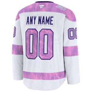 Join the fight and show support with the Custom Philadelphia Flyers White Purple 2024 Hockey Fights Cancer Premium Jersey. This special edition celebrates Pennsylvania state pride and the Flyers’ commitment to making a difference. It features stitched name and number and embroidered logos and patches in the signature purple and white colorway symbolizing hope and strength. Customize it to honor a loved one or cause, and wear it proudly as part of the PHI Flyers community’s effort to inspire change through hockey.