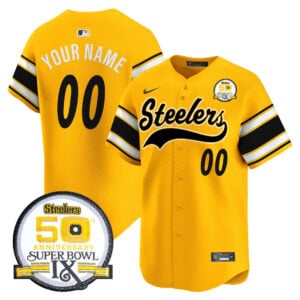 Bring bold energy to your collection with the Steelers 50th Anniversary Super Bowl IX Gold Baseball Jersey. Inspired by Pittsburgh pride, this jersey highlights the Steelers name, short name identity, and championship legacy. The name, number, logo, and Super Bowl IX patch are stitched or embroidered for rich texture and standout detail. Gold tones make this piece pop while still respecting tradition. Oversized sizes are available for fans who want comfort with serious visual impact.