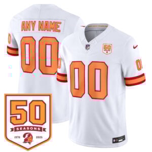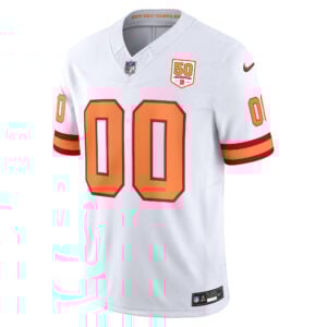 Make it your own with the Custom Tampa Bay Buccaneers 50th Season White ’76 Vapor F.U.S.E Limited Jersey – All Stitched. Built with stitched details, embroidered patches, and a celebration of Tampa Bay tradition, this jersey is Florida pride personalized.