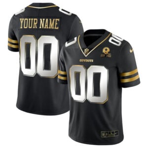 We want fans to celebrate their fandom by customizing and personalizing certain products. For these customizable products, including jerseys, we invite customers to tell us how they would like their preferred name or other text to appear by typing that text into the field indicated. Give your jersey collection a boost with the help of this Dallas Cowboys “Gold Series” Black Gold Custom Jersey – All Stitched. Crafted using the lightweight comfort of stretch mesh fabric, it features an authentic look with twill details. The innovative jersey chassis allows for more flexible movement and teams up as you cheer on the Dallas Cowboys.