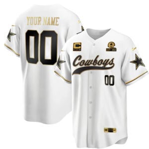 We want fans to celebrate their fandom by customizing and personalizing certain products. For these customizable products, including jerseys, we invite customers to tell us how they would like their preferred name or other text to appear by typing that text into the field indicated. Give your jersey collection a boost with the help of this Dallas Cowboys White Gold Baseball Custom Jersey – All Stitched. Crafted using the lightweight comfort of stretch mesh fabric, it features an authentic look with twill details. The innovative jersey chassis allows for more flexible movement and teams up as you cheer on the Dallas Cowboys.