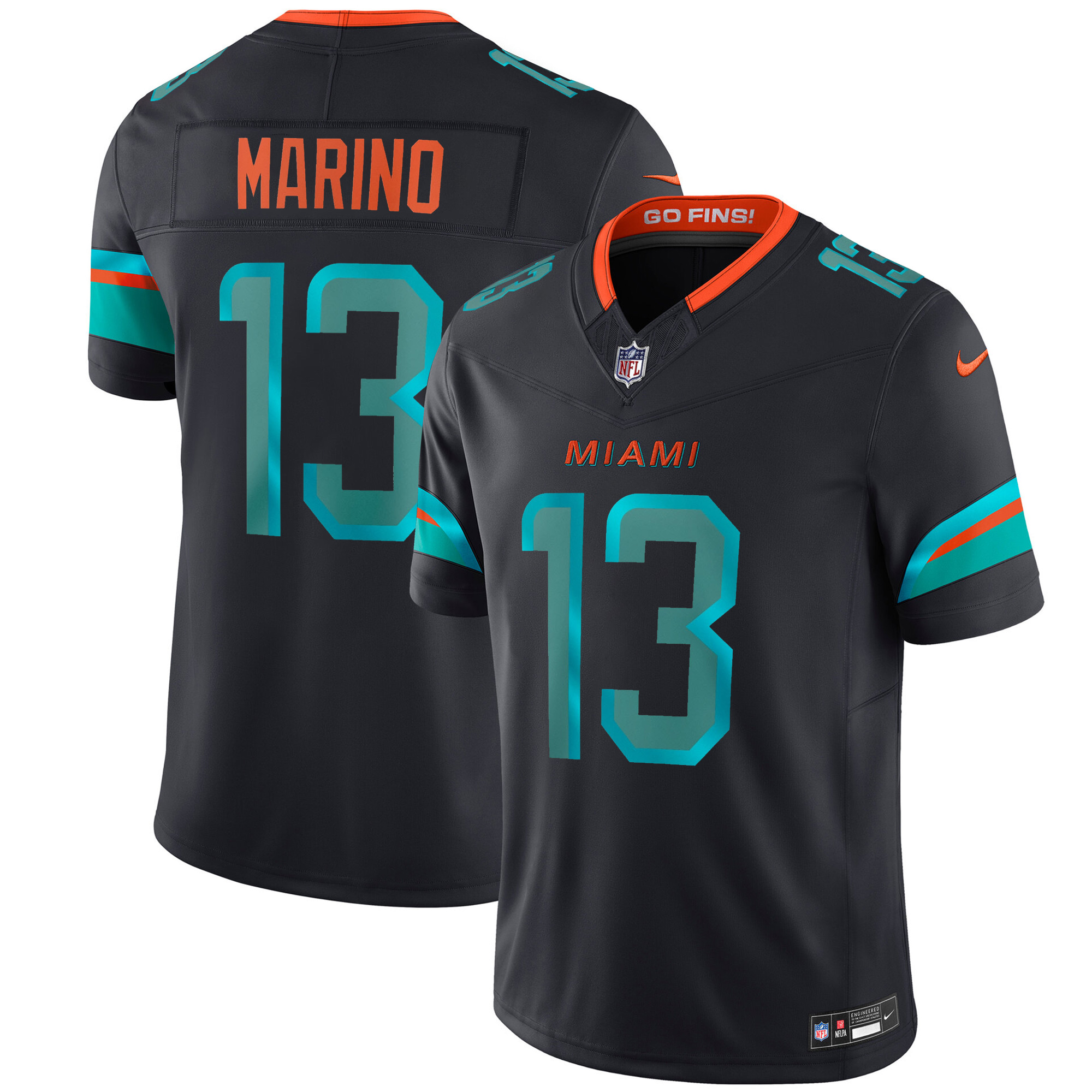 Commemorate greatness with the Dan Marino Miami Dolphins Pitch Blue 2025 Rivalries Collection Limited Jersey. This Florida-inspired Limited edition brings together Rivalries Collection history and modern upgrades. The Limited cut includes standard fit, Dri-FIT fabric, heat-transferred twill details, and a chainmaille mesh grill collar. To complete the premium feel, the stitched name, number, embroidered logo, and patch connect fans to the Dolphins legend and their state pride.