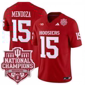 Celebrate Indiana University’s championship season with this crimson Fernando Mendoza CFP National Championship jersey. Representing IU and the Hoosiers’ first national title, this design blends player recognition with team history. The stitched name and number provide a premium feel, while embroidered championship patches and team logos showcase the achievement in detail. Built for fans who value legacy moments and standout players, this jersey fits any collection. Comfortable and versatile, oversized sizes are also available.