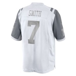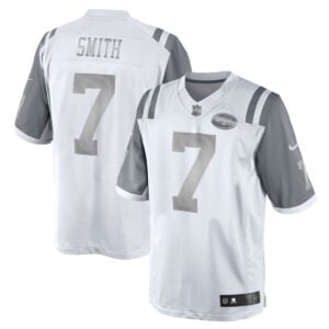 Elevate your game day attire with this Geno Smith New York Jets White Platinum Jersey – All Stitched. This sleek, high-quality jersey is a must-have for any dedicated fan looking to represent their favorite quarterback in style. Geno Smith left his mark on New York with his resilience and dual-threat capabilities, providing memorable moments for the fans during his tenure. Featuring all-stitched details for durability and a premium feel, this jersey captures the essence of the team’s spirit. Our commitment to quality has been satisfied by thousands of customers who trust us for their apparel needs. Whether you are at the stadium or watching from home, it’s perfect to buy for your love of sports or as a great gift.