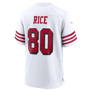 This Jerry Rice San Francisco 49ers White Alternate Game Jersey – All Stitched is an essential piece of gear for any San Francisco 49ers fan looking to highlight their favorite jersey and player. The Jerry Rice San Francisco 49ers White Alternate Game Jersey and team details provide a kickoff-ready look that elevates your excitement for game day. Made with comfort in mind, this Personalized San Francisco 49ers jersey delivers a standard, lightweight fit and features breathable mesh side panels for added ventilation.