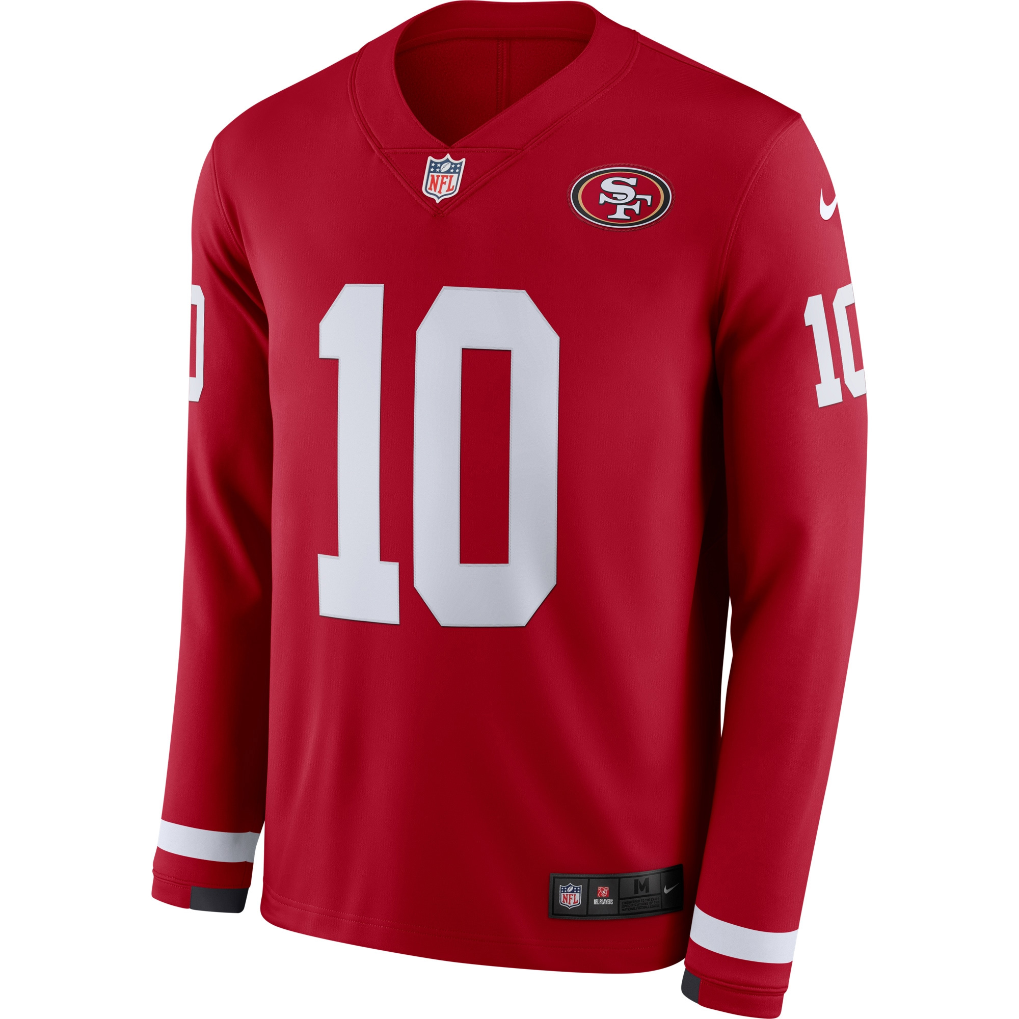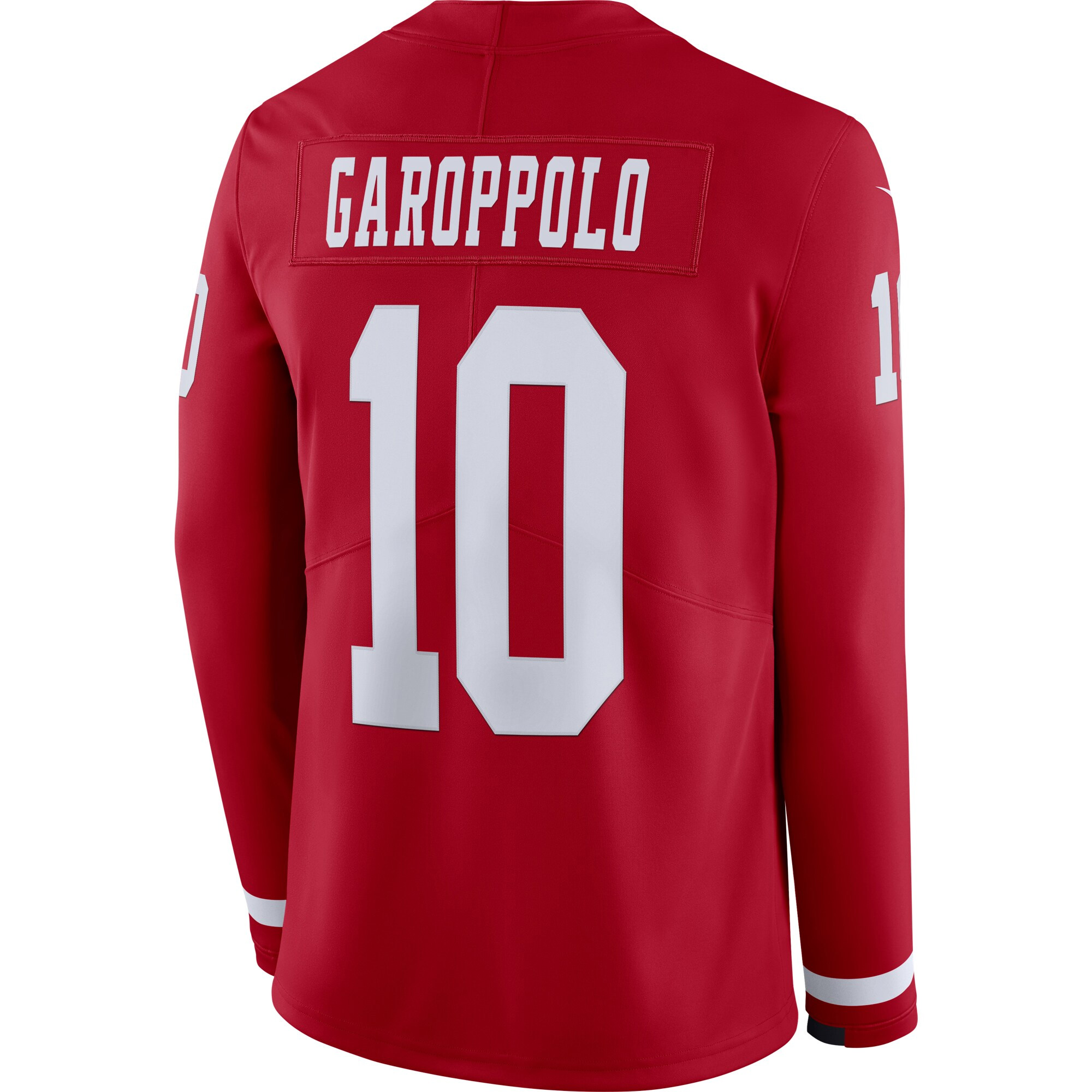 Step into California football tradition with this San Francisco 49ers Scarlet Therma Long Sleeve Jersey featuring Jimmy Garoppolo. The deep scarlet proudly represents the “SF” identity and Northern California pride. With bold stitched name and number and a sharp embroidered 49ers logo, this jersey perfectly blends classic team style with modern comfort. The Therma fabric keeps you warm on chilly Bay Area days, making it ideal for dedicated fans who rep the Niners year-round.