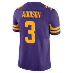 The Jordan Addison Minnesota Vikings Purple Alternate Vapor F.U.S.E Limited Jersey – All Stitched embodies youthful energy with stitched player details, embroidered Vikings logos, and bold alternate design. Fans across Minnesota will connect with this dynamic look.