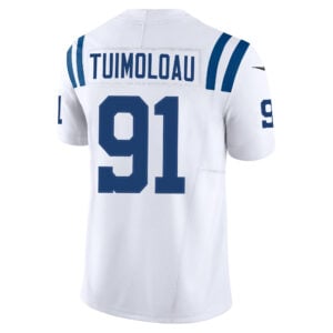 This JT Tuimoloau Indianapolis Colts White Away Vapor F.U.S.E Limited Jersey – All Stitched is an essential piece of gear for any Indianapolis Colts fan looking to highlight their favorite jersey and player. The JT Tuimoloau Indianapolis Colts White Away Vapor F.U.S.E Limited Jersey and team details provide a kickoff-ready look that elevates your excitement for game day. Made with comfort in mind, this Personalized Indianapolis Colts jersey delivers a standard, lightweight fit and features breathable mesh side panels for added ventilation.