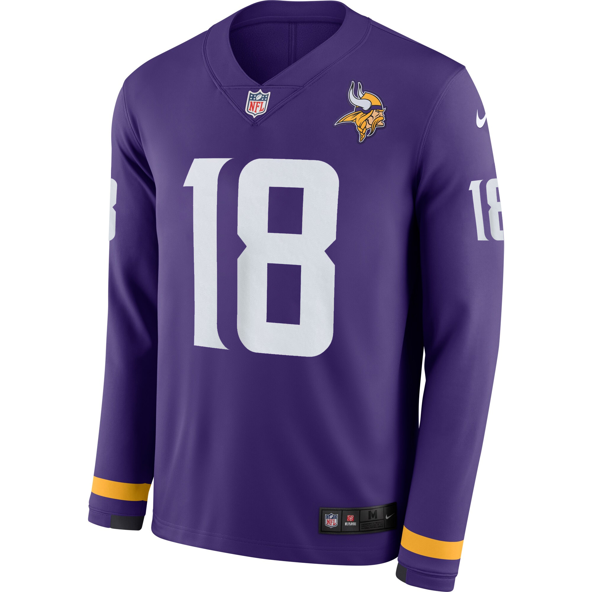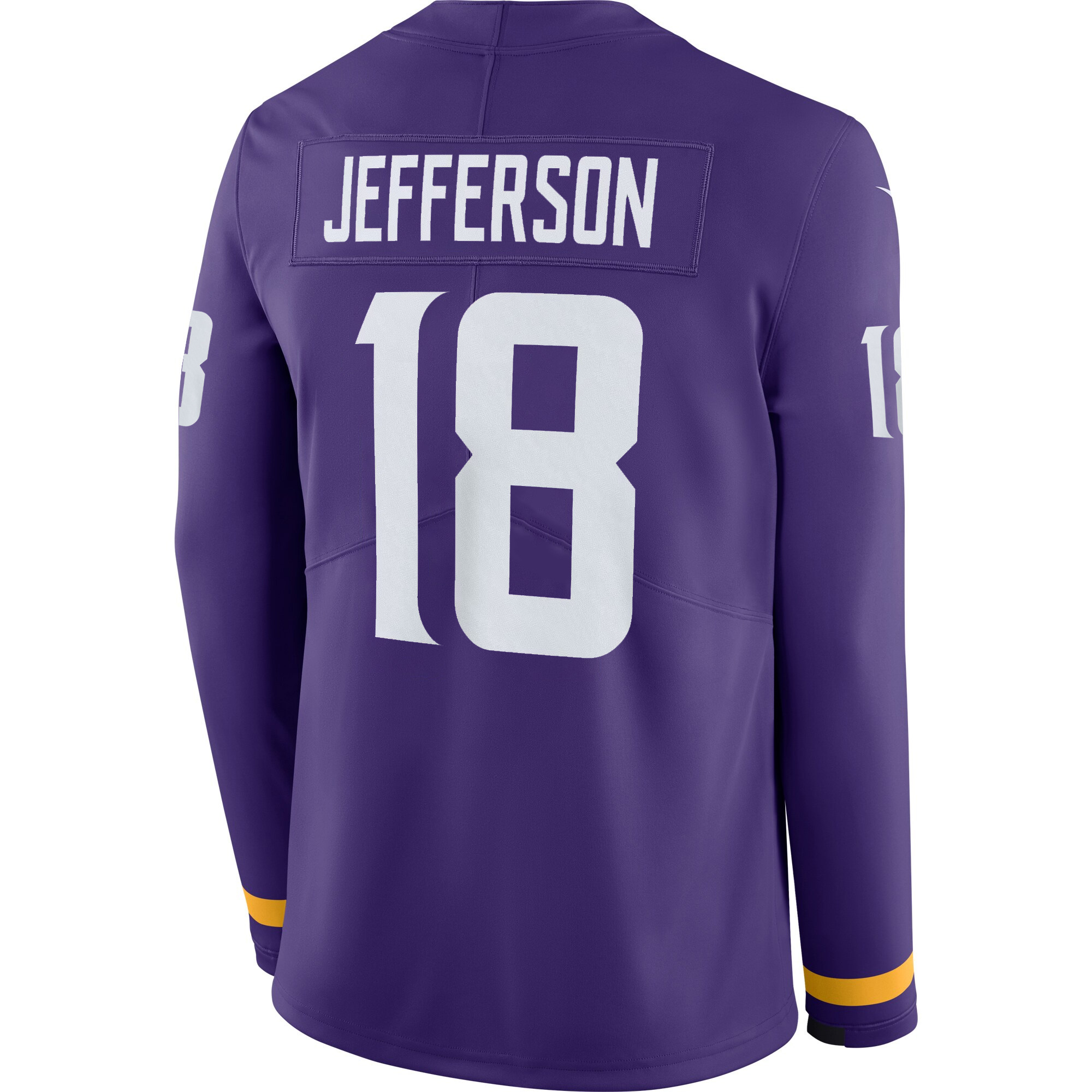 Jefferson’s name and number are stitched for durability. The Vikings logo and team patch are embroidered, adding premium detail. Therma long sleeves offer warmth through Minnesota’s cold months.
