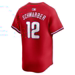 This Kyle Schwarber Philadelphia Phillies Red Alternate Limited Jersey – All Stitched is an essential piece of gear for any Philadelphia Phillies fan looking to highlight their favorite jersey and player. The Kyle Schwarber Philadelphia Phillies Red Alternate Limited Jersey and team details provide a kickoff-ready look that elevates your excitement for game day. Made with comfort in mind, this Philadelphia Phillies jersey delivers a standard, lightweight fit and features breathable mesh side panels for added ventilation.
