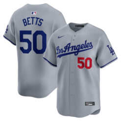 This Mookie Betts Los Angeles Dodgers Grey Road Limited Jersey – All Stitched is an essential piece of gear for any Los Angeles Dodgers fan looking to highlight their favorite jersey and player. The Mookie Betts Los Angeles Dodgers Grey Road Limited Jersey and team details provide a kickoff-ready look that elevates your excitement for game day. Made with comfort in mind, this Mookie Betts Los Angeles Dodgers jersey delivers a standard, lightweight fit and features breathable mesh side panels for added ventilation.