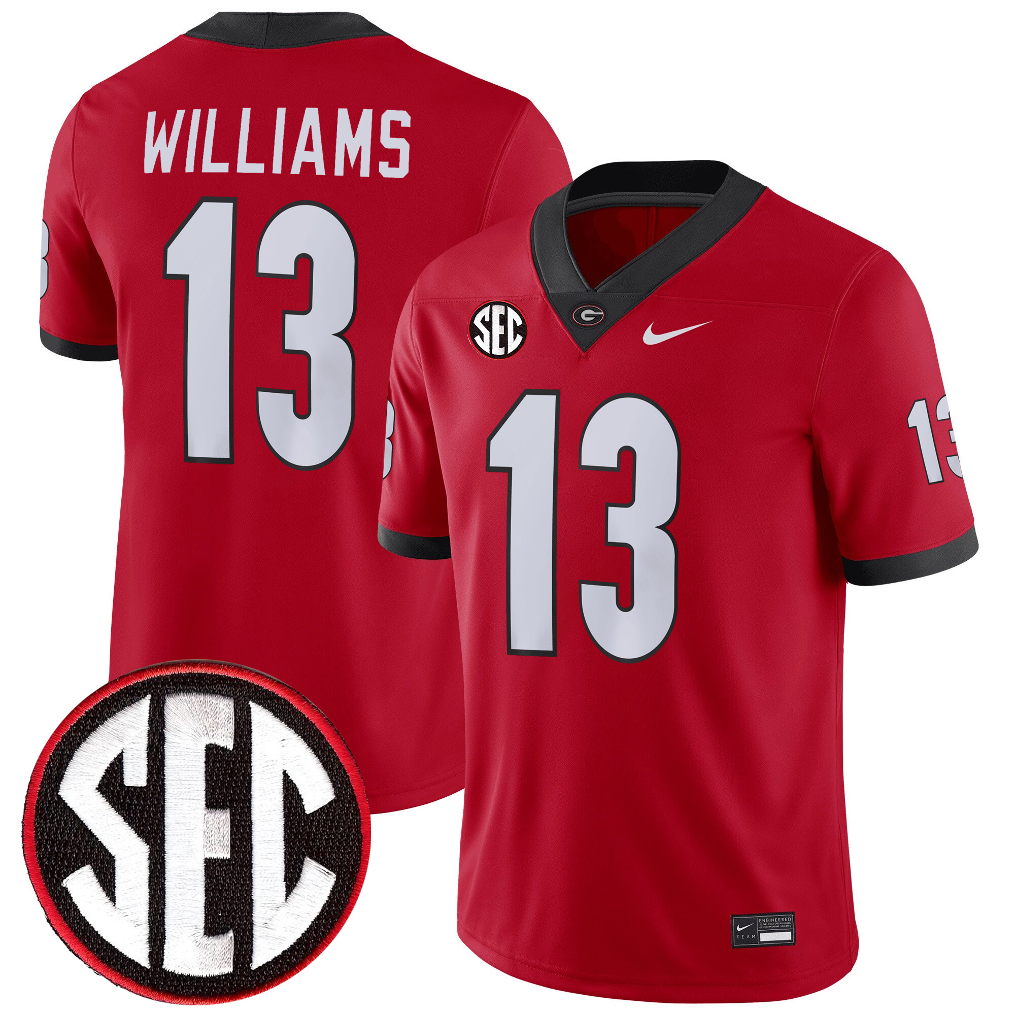 Rep bold Georgia pride with this Mykel Williams Georgia Bulldogs Red Home Game Jersey featuring a fully stitched SEC patch. The University of Georgia’s classic red look stands strong with stitched name, stitched numbers, stitched logo, and stitched conference patch, giving the jersey a sharp, durable finish.