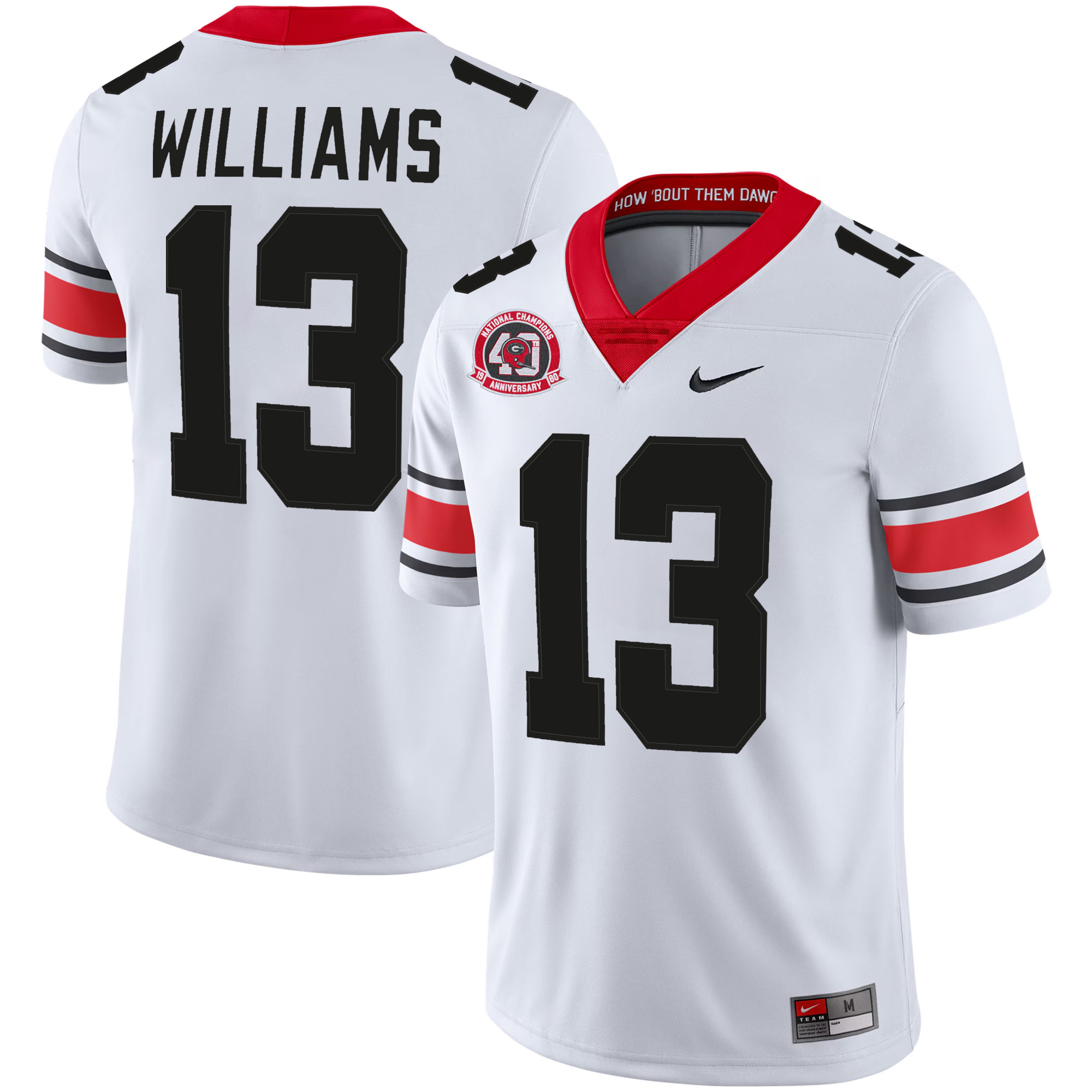 Honor a historic milestone in Georgia football with this Mykel Williams Georgia Bulldogs Football White 40th NC Anniversary Jersey. Celebrating the University of Georgia’s championship legacy, this special edition features a clean white base paired with fully stitched name, stitched numbers, stitched anniversary patch, and stitched team logo for a standout finish.