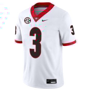 The crisp white base pops with Georgia’s signature red and black accents, capturing the energy of Dawgs fans across the state. Whether worn to away matchups or as part of your everyday Georgia rotation, this jersey delivers a standout UGA look.