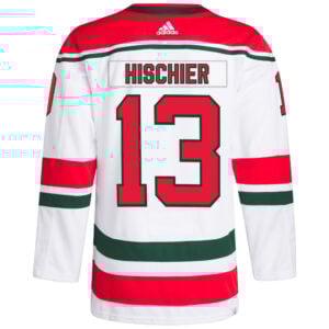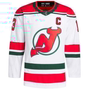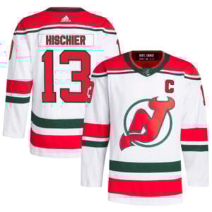 Stay sharp in the Nico Hischier New Jersey Devils White Primegreen Jersey. This eco-friendly jersey features stitched logos, embroidered numbers, patches, and Hischier’s name, allowing fans to combine Devils passion with sustainability.