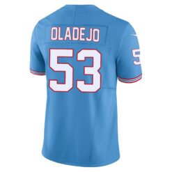 This Oluwafemi Oladejo Tennessee Titans Light Blue Alternate Oilers Throwback Vapor F.U.S.E Limited Jersey – All Stitched is an essential piece of gear for any Tennessee Titans fan looking to highlight their favorite jersey and player. The Oluwafemi Oladejo Tennessee Titans Light Blue Alternate Oilers Throwback Vapor F.U.S.E Limited Jersey and team details provide a kickoff-ready look that elevates your excitement for game day. Made with comfort in mind, this Oluwafemi Oladejo Tennessee Titans jersey delivers a standard, lightweight fit and features breathable mesh side panels for added ventilation.