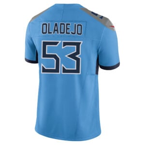 This Oluwafemi Oladejo Tennessee Titans Light Blue Home Vapor F.U.S.E Limited Jersey – All Stitched is an essential piece of gear for any Tennessee Titans fan looking to highlight their favorite jersey and player. The Oluwafemi Oladejo Tennessee Titans Light Blue Home Vapor F.U.S.E Limited Jersey and team details provide a kickoff-ready look that elevates your excitement for game day. Made with comfort in mind, this Oluwafemi Oladejo Tennessee Titans jersey delivers a standard, lightweight fit and features breathable mesh side panels for added ventilation.