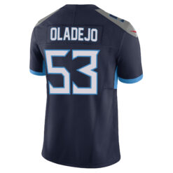 This Oluwafemi Oladejo Tennessee Titans Navy Alternate Vapor F.U.S.E Limited Jersey – All Stitched is an essential piece of gear for any Tennessee Titans fan looking to highlight their favorite jersey and player. The Oluwafemi Oladejo Tennessee Titans Navy Alternate Vapor F.U.S.E Limited Jersey and team details provide a kickoff-ready look that elevates your excitement for game day. Made with comfort in mind, this Oluwafemi Oladejo Tennessee Titans jersey delivers a standard, lightweight fit and features breathable mesh side panels for added ventilation.