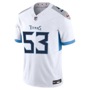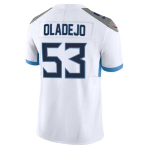 This Oluwafemi Oladejo Tennessee Titans White Road Vapor F.U.S.E Limited Jersey – All Stitched is an essential piece of gear for any Tennessee Titans fan looking to highlight their favorite jersey and player. The Oluwafemi Oladejo Tennessee Titans White Road Vapor F.U.S.E Limited Jersey and team details provide a kickoff-ready look that elevates your excitement for game day. Made with comfort in mind, this Oluwafemi Oladejo Tennessee Titans jersey delivers a standard, lightweight fit and features breathable mesh side panels for added ventilation.
